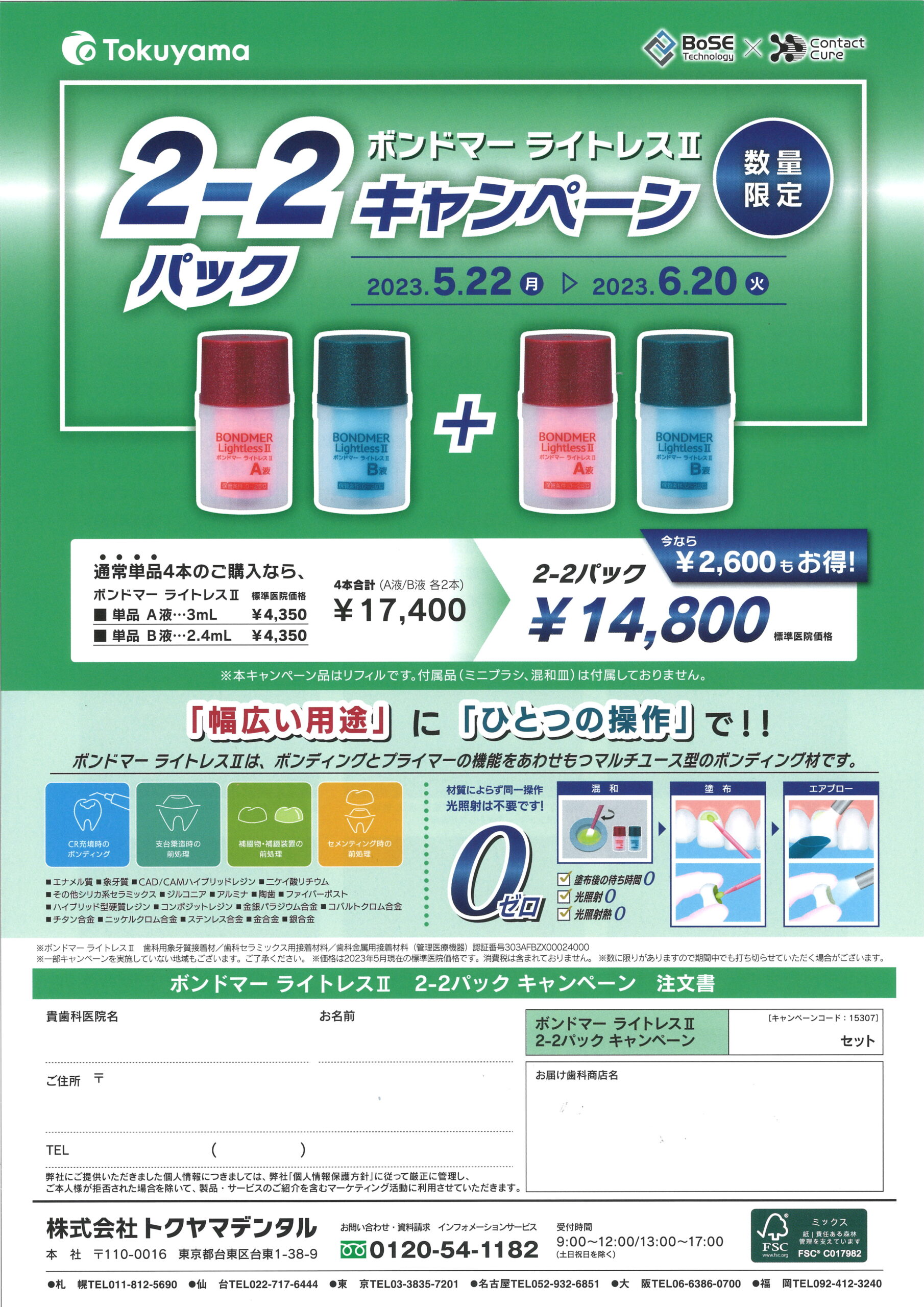 2回目の更新はトクヤマデンタルのお得なパックキャンペーンのご案内です。 昨年リニューアルされたボンドマー ライトレスⅡですが、A液、B液が2本ずつ セットになった2-2パックが期間限定で販売中です。 予定数が終了次第販売終了となりますのでご注文はお早めに。