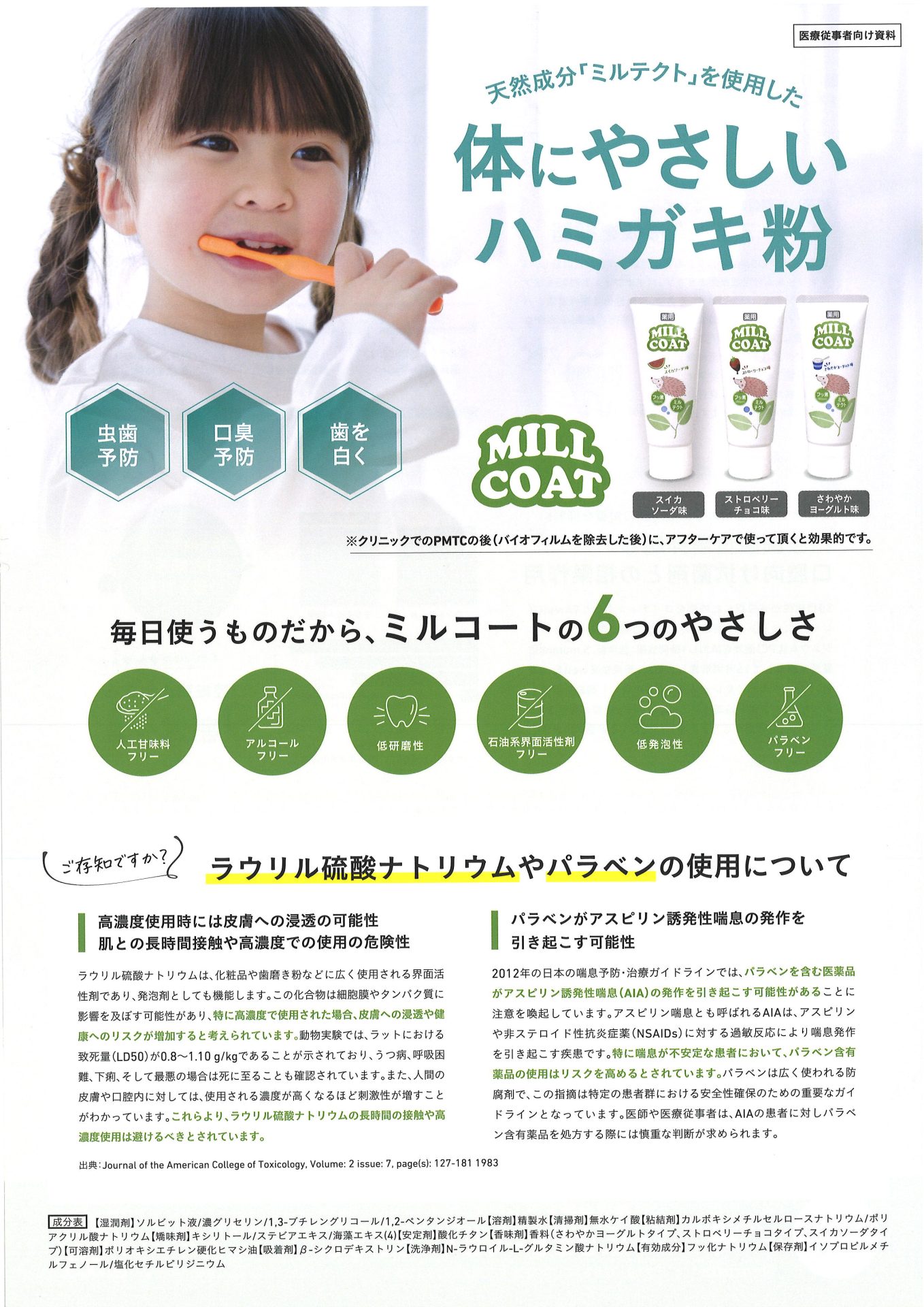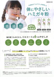 海藻の一種ミルから抽出されたエキス、ミルテクトを使用した体にやさしいハミガキ粉「ミルコート」のご案内です。