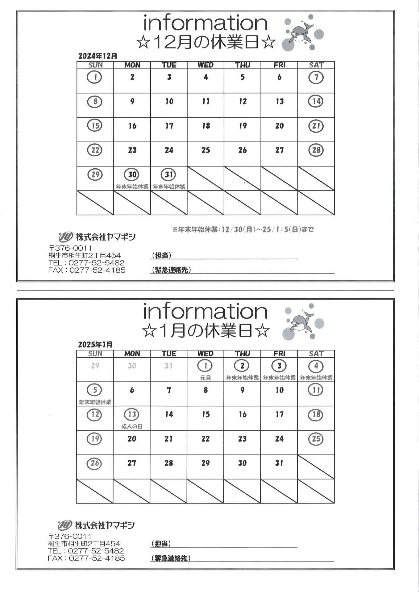 2024年12月・2025年1月 休業日のご案内