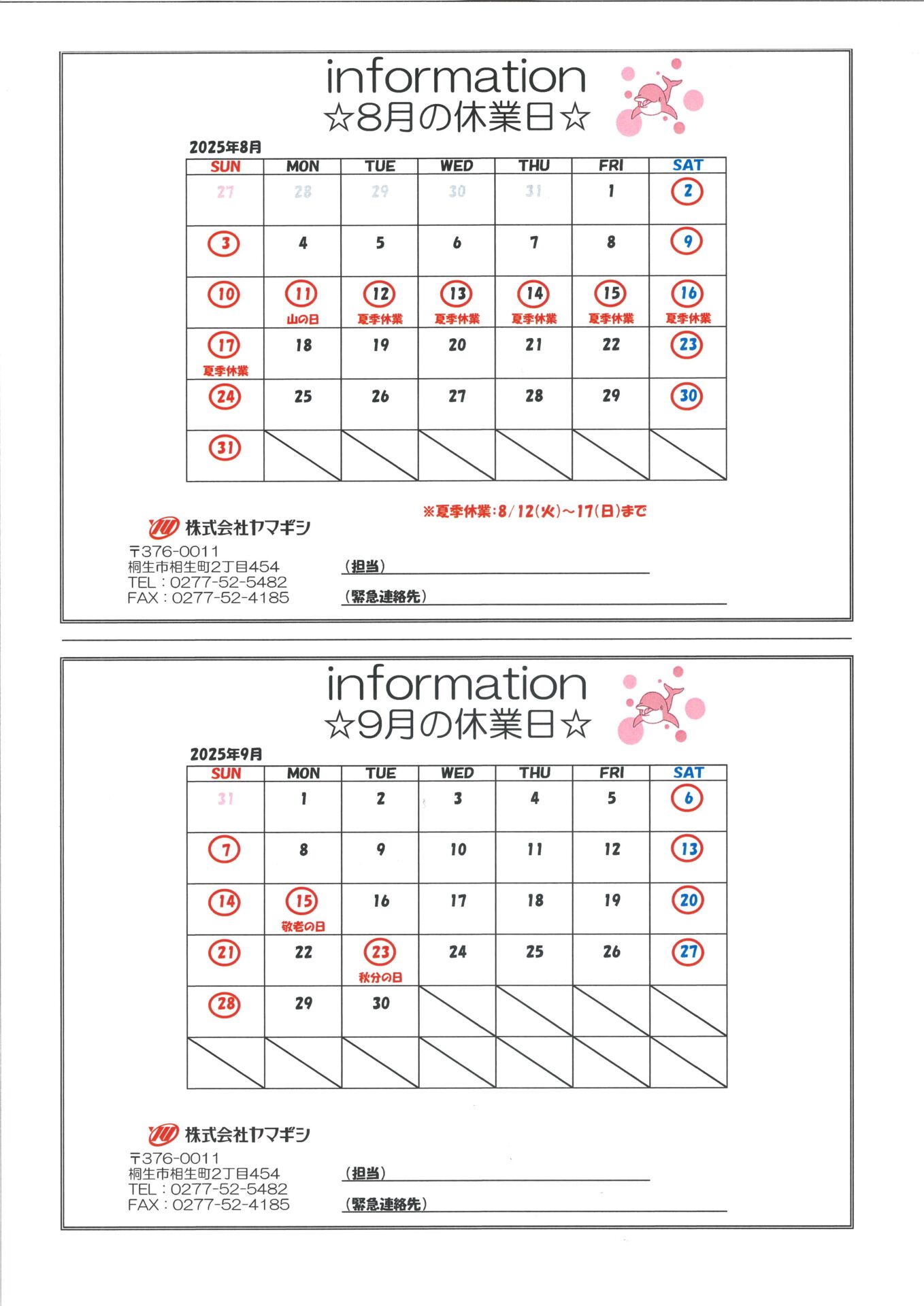 2025年8月・9月 休業日のご案内 Copy