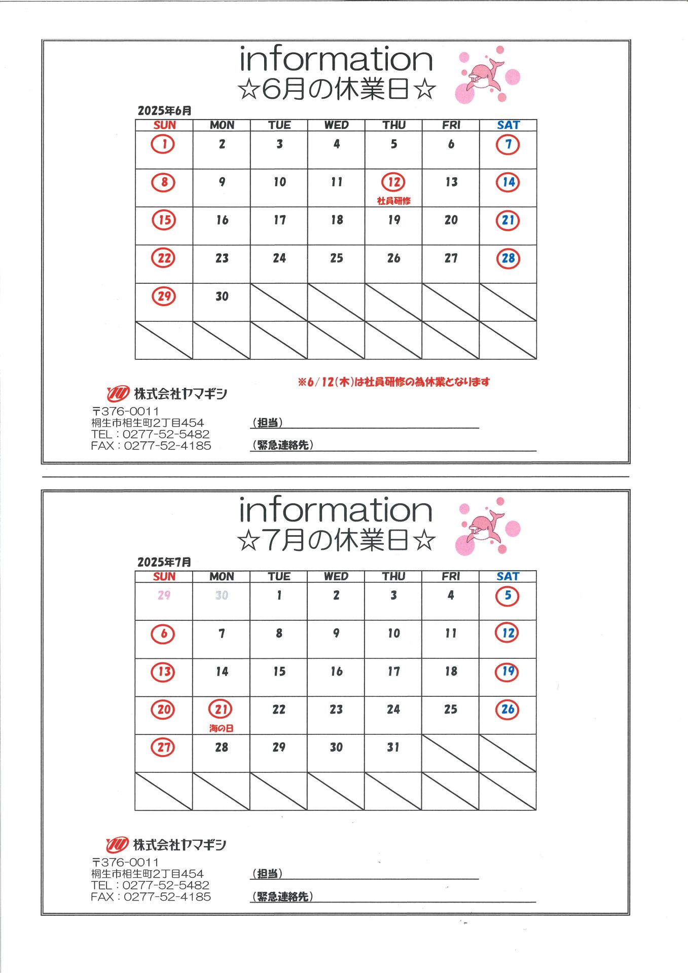 弊社2025年6月・7月の休業日のご案内です。