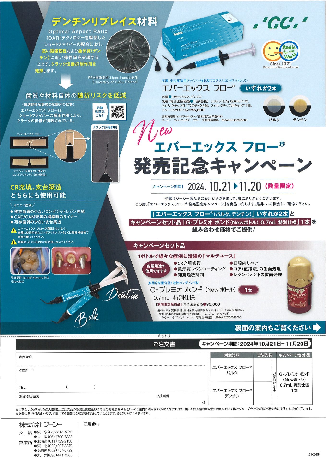 「エバーエックスフロー®(バルク、デンチン)」いずれか2本と、キャンペーンセット品「G-プレミオボンド(Newボトル)0.7mL特別仕様」1本を組み合わせ価格でご提供となっております。