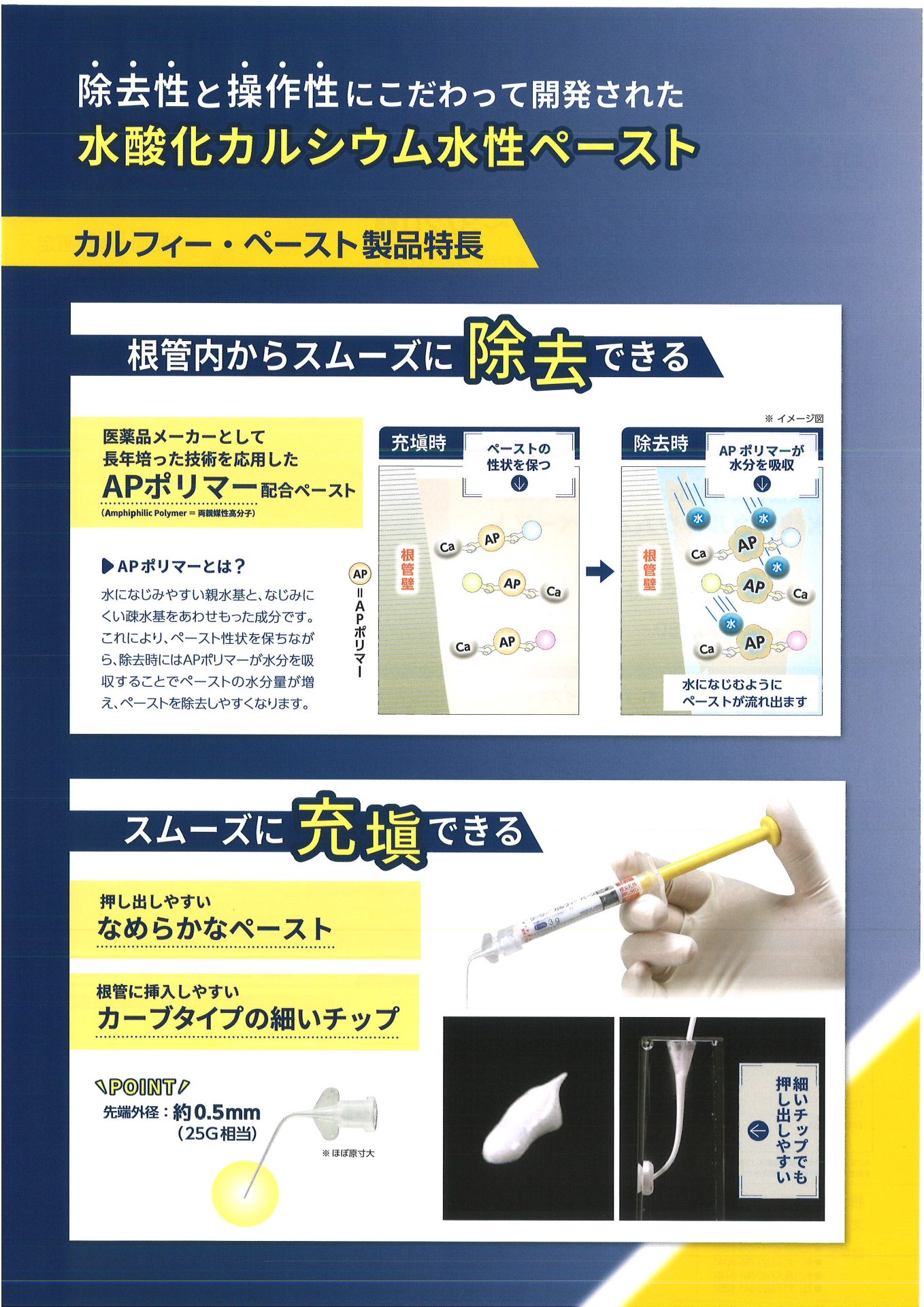 こちらの製品は除去性と操作性にこだわって開発された水酸化カルシウム水性ペーストとなっております。